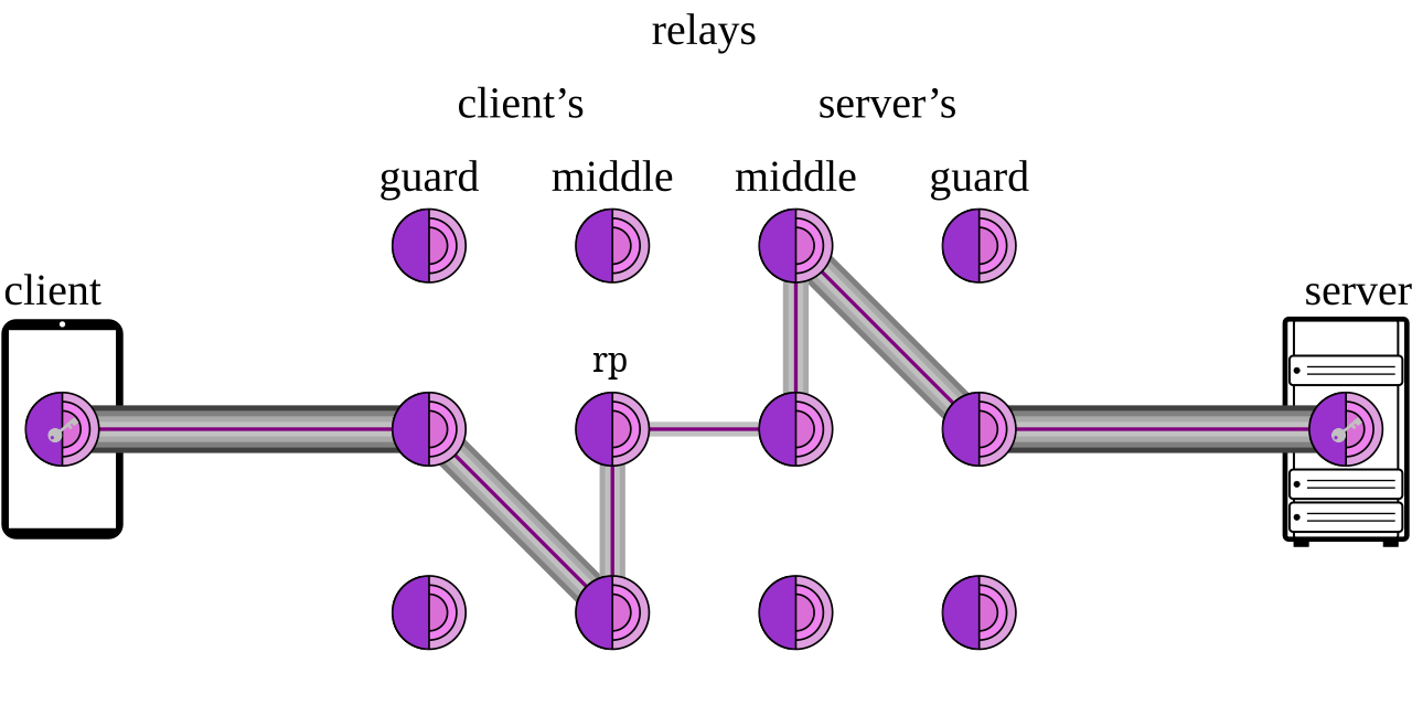 Der Vollständigkeit halber: auf dem Weg zurück zum Client kehrt sich das Prinzip um, d.h. die Antwort des Webservers wird von jedem Knoten einmal zusätzlich verschlüsselt und erst der Client entfernt beim Erhalt der Nachricht alle drei Verschlüsselungsschichten.